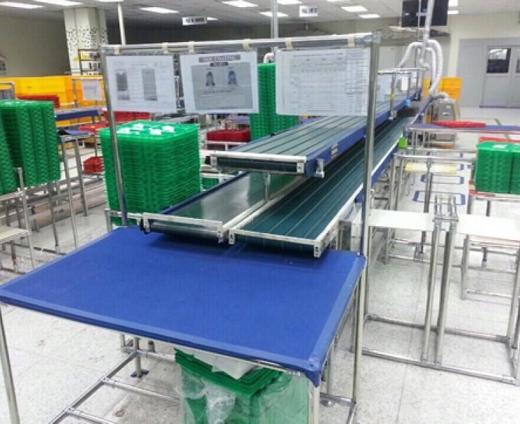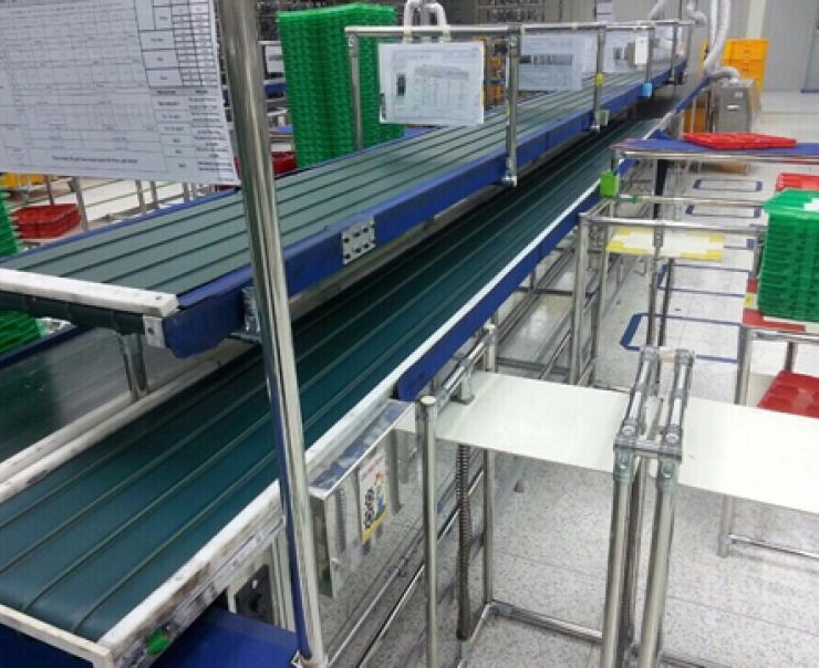 Thông số kĩ thuật: nhôm định hình 40*40, Belt PU chống tĩnh điện, dán 4 gân, 2 tầng, động cơ 180W