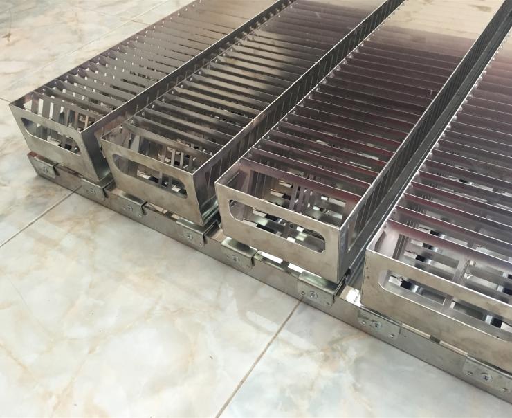Mô tả: giá sấy bao gồm 5 khay, mỗi khay được chia làm 48 ngăn nhỏ được cắt laser & hàn nghiêng 45 độ. Sản phẩm sau khi rửa sẽ được đặt vào từng ngăn và đưa vào buồn sấy. Các khay đều có cữ chặn để khống chế chuyển động.